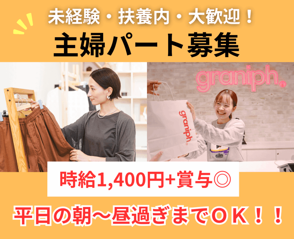 「久しぶりのパート、ちゃんと続けられるかな…」そんな方も安心。グラニフは家庭との両立を大切にできるアパレルのお仕事です。お子さんの行事やご家庭の予定も相談しやす…