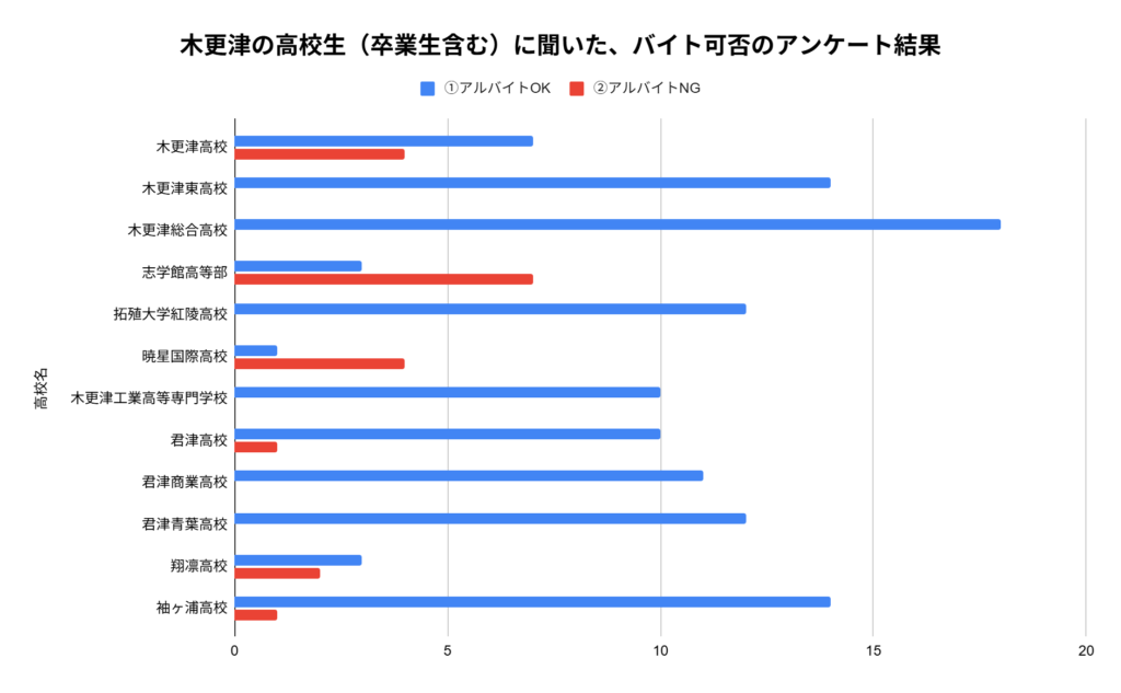木更津の高校では、学校ごとにアルバイトの可否が異なります。以前、木更津エリアの高校生を対象にアンケートを行ったところ、高校によって「バイトOK」「条件付きOK」「基本NG」など違いがあることが分かりました。