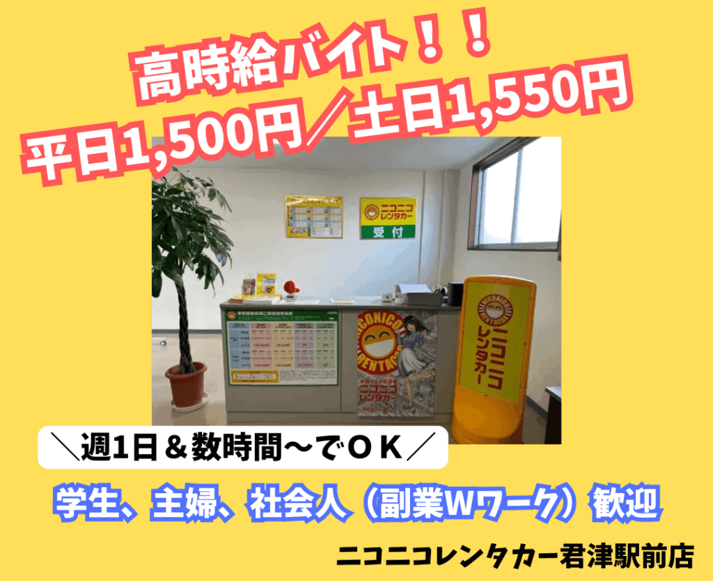 (君津駅徒歩1分)高時給1,500円/土日祝は1,550円!◎人気の受付スタッフ募集『ニコニコレンタカー君津駅前店』