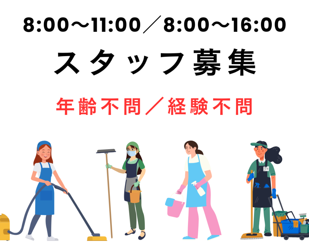 週3日程度、好きな時間で1日1~2時間程度、店内清掃をしていただける方を募集しています。経験や年齢等は全て不問で、9:30~15:30の間で勤務できる時間に出勤をお願いしま…