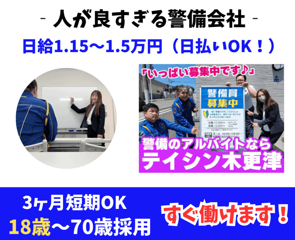 18歳~70歳まで即採用!!すぐ働けます!!「テイシン警備木更津支社」